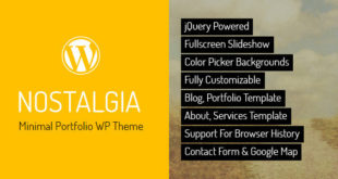 Nostalgia is a minimal portfolio WordPress Theme – personal or corporate, based on full-screen slideshow and sliding pages. The Theme is maintained in a minimalist, contrasting style. Background images kept in retro tones contrast with modern minimalist content. It is possible to add unlimited number of pages in the form of scrolling menu.Demo: https://themeforest.net/item/nostalgia-portfolio-wordpress-theme/2438038 Do you need any custome Development Click here and fill your requirement...
