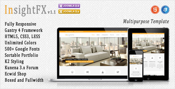 InsightFX is an amazing multipurpose Joomla 2.5/3.x template. It is fully responsive and has many custom modules. It also offers unlimited color variations, two menu variations – Dark and Light and two Layout option to choose from – Boxed and Fullscreen. InsightFX is built on the well-known Gantry Framework and it is perfect for any kind of websites, from a Corporate/Business website to Online Shop and Forums! InsightFX also comes with three homepage variations. InsightFX is simply one of the most powerful multipurpose templates available on the Web!