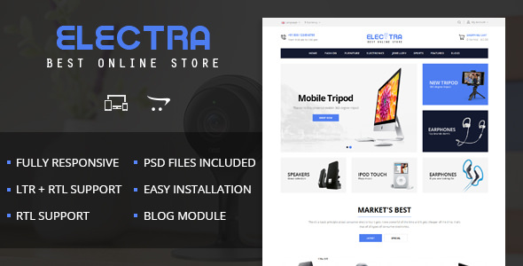 Electra OpenCart Responsive Theme is specially designed for Digital, Electronics, Mobile, Camera, Computers, Music, Accessories, Medicine, Bags, Furniture, Minimal and Multipurpose purpose store.