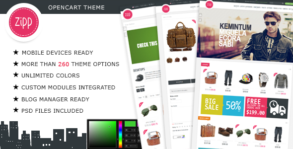 Zipp is a Premium, Responsive OpenCart eCommerce theme with a clean and neat design. It’s perfect for any kind of web shop. It looks great with all types of devices (laptops, tablets and mobiles). Open demo site and resize the browser window. It also includes a Theme Panel with more than 260 theme options and unlimited colors.