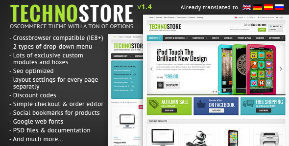 TechnoStore Oscommerce Template is a fully-functional theme with a professional looking clean layout and exclusively developed and improved admin panel. It includes a tone of outstanding functionalities which will allow you to adjust this template according all your demands. It can be great for such stores as electronics, computers, gifts, music, clipart, sport equipment, furniture, etc.