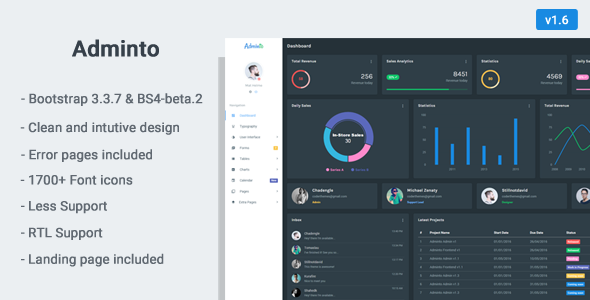 Adminto is a bootstrap based premium admin template. It has super clean user interface, customizable components and widgets and three different color schemes. It is fully responsive and easy to customize. The code is super easy to understand and gives power to any developer to turn this theme into real web application.