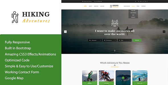 Hiking Adventures– is unique and modern HTML template. It’s good for your Hiking, Adventures & Action Sports. It’s fully responsive and easy to customize. Really cool design which keeps up with web-desing trends.
