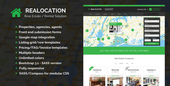 Flat, modern and clean design Google map with custom markers Locations and sublocations support Agency/Agents detail and listing pages 8 custom styles of map 5 header versions Dark/Light header Boxed/Wide layout Dark/Light footer