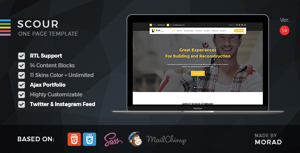 Scour is a Construction HTML landing page template with RTL support and ajax portfolio. In addition real flexibility and customization. It comes with 3 header nav styles and 4 banner options. We hope you like it!