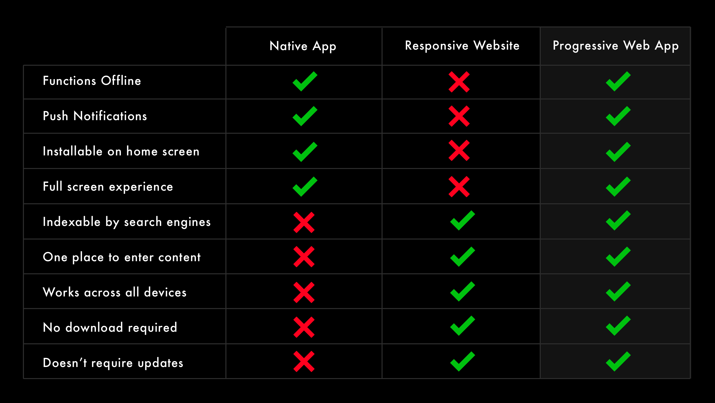 Take a look at the graphic below comparing PWAs to native apps and responsive websites.