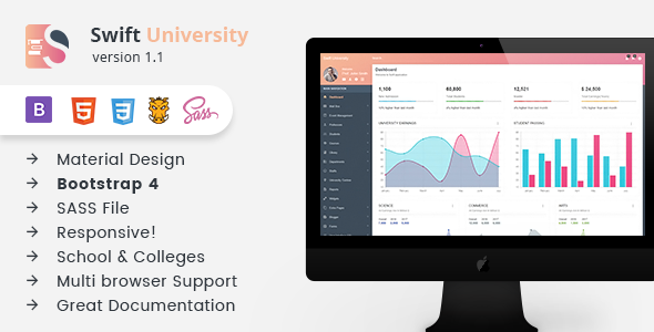 Swift University Admin is Bootstrap4 Material Design premium admin dashboard theme. The template is used for University, Collage and School.