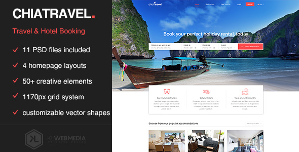 Chiatravel is a PSD template for Travel, Tour, Flight, Hotel Booking and Event websites. It is a highly suitable template for all type of businesses that offer travelling tours and flights. It has purpose oriented design, responsive layout and special features like appointment forms, services, eventplanner, schedules, pricing plans and other pages.