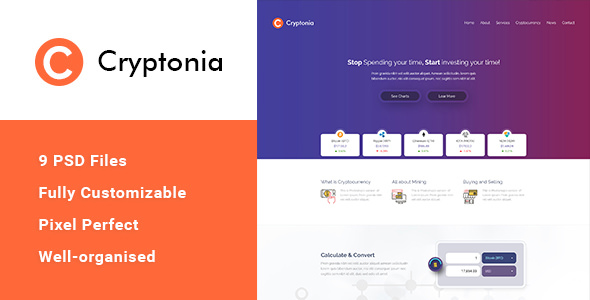 Cryptonia is a Cryptocyrrency Template made for traders & miners.. it is fully customizable and easy to edit. it Contains 9 PSD file which is are layered and all the layers are grouped and named properly into folders