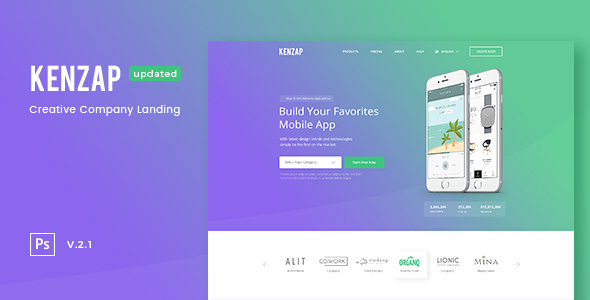 Kenzap is a modern and clean landing page design template for Creative Company. This template includes homepage, product page, pricing, and product detail. It’s completed template and ready for your company/office. These PSD files are Easy to custom, Well Layered and properly named.