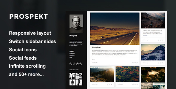 A gallery style Tumblr theme with a sleek sidebar, with over 50 customize options. Prospekt allows you to highlight a post by tagging it with “large”.