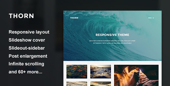 Thorn is a responsive grid tumblr theme built specifically for photo bloggers. It features a auto-looping slideshow cover and a slide-out sidebar. It is also packed with an strong set of customize options, that allows you to give your site a much more personal look.