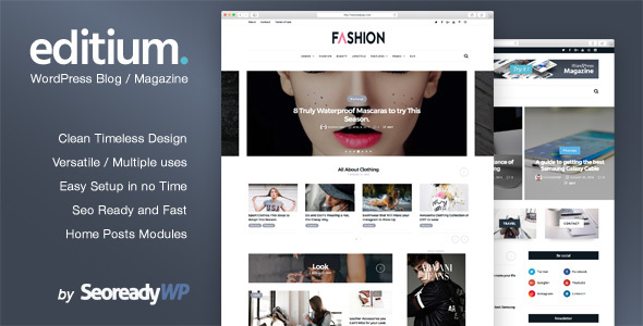 Editium is a clean and timeless WordPress Blog / NewsPaper Magazine theme to put onwards your content. Enjoy a very easy setup with many options, but not as many as to get lost. Bring your new website online in no time with our theme. Delight your visitors with a finely crafted theme to give them a comfortable user experience on every devices.
