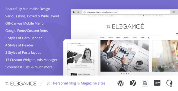 Responsive layout, Clean and Minimalist design, Elegance WordPress theme is built with love and passion for Personal Blog, Fashionistas or Food Recipes Magazine… Based on Underscores (_s) and Bootstrap Framework with Unlimited flexibility.