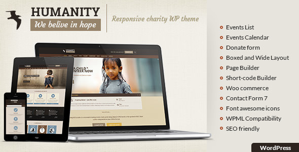 Humanity is a responsive nonprofit, charity, NGO, Premium WordPress Theme. It exudes a positive impression that is best suited for Charity, Non-governmental organization, foundations, etc. Includes all the necessary theme features that your non-profit website could possibly need. It is very easy to set up, very flexible and not a pain to maintain.